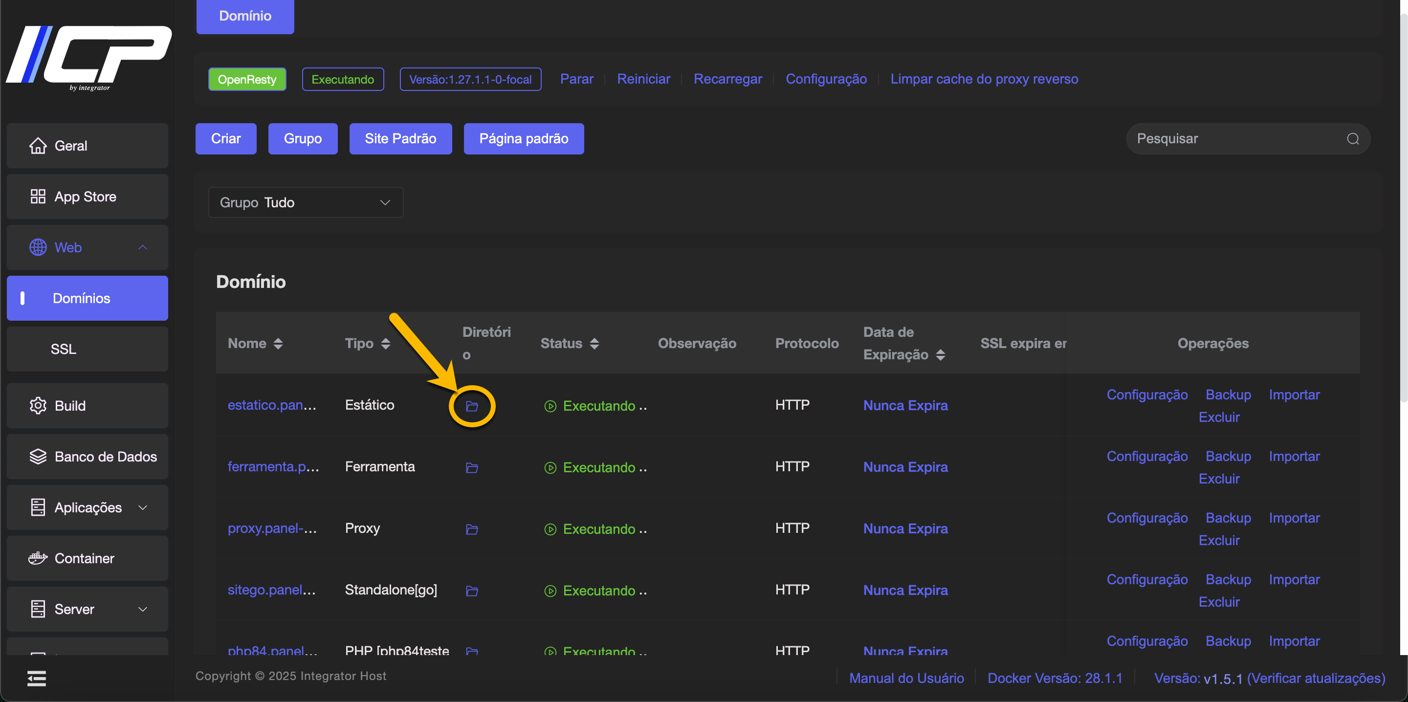 2. Após criar o domínio, clique no ícone de pasta