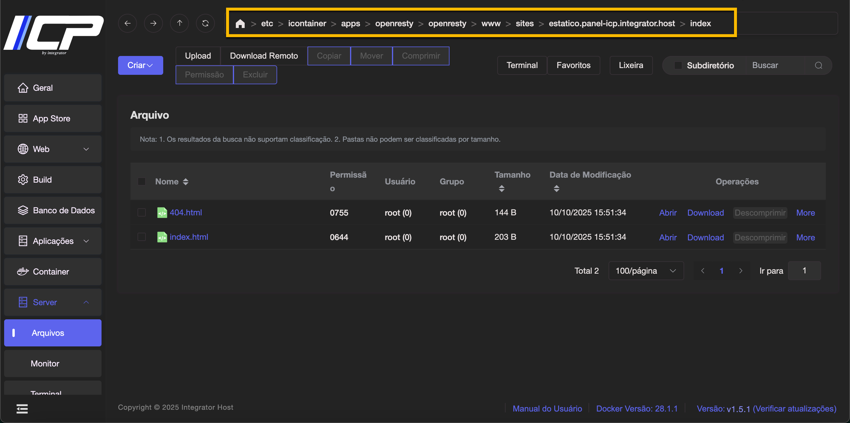 Você será redirecionado automaticamente para o diretório raiz do seu domínio, chamado index.