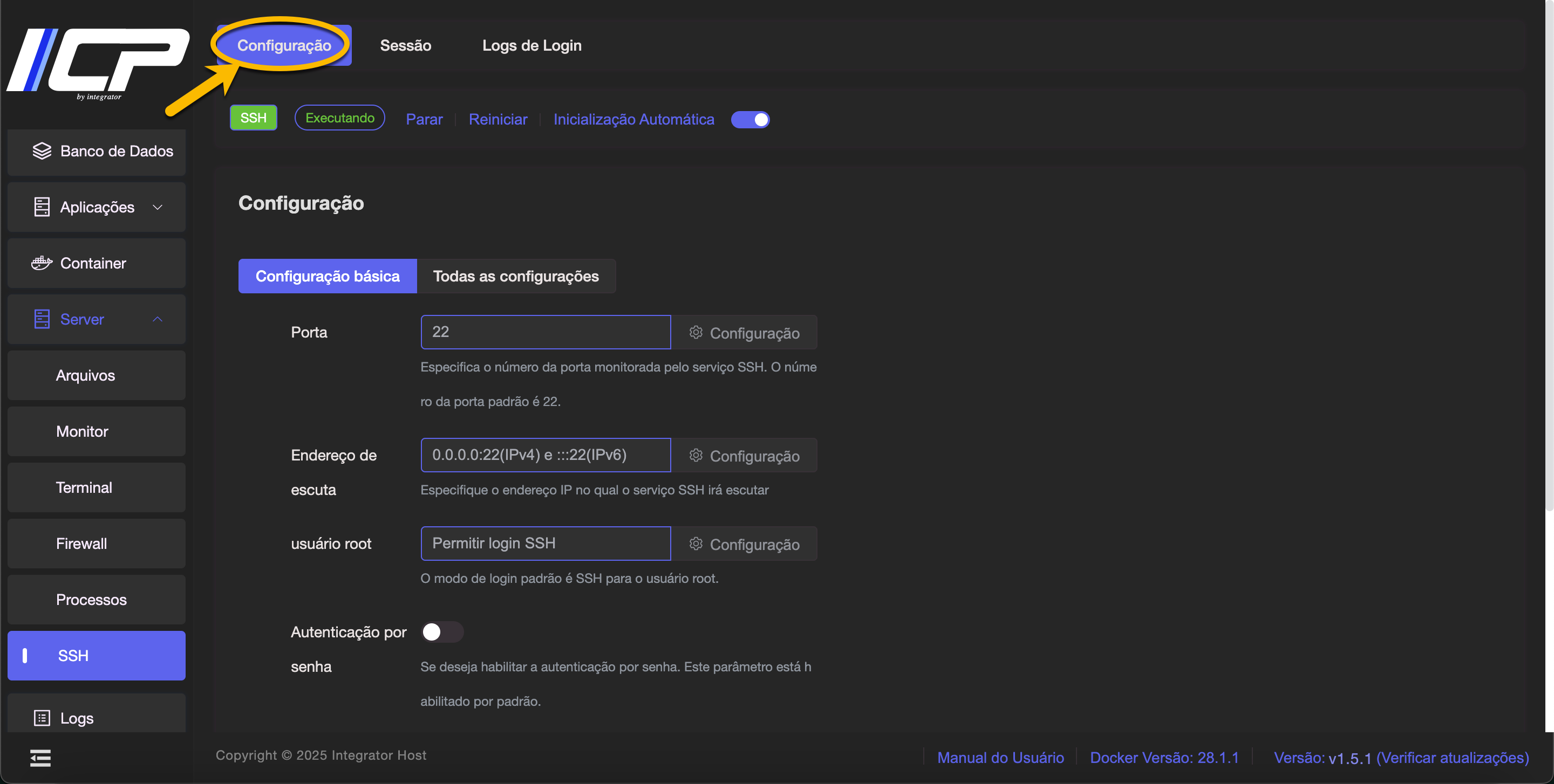 Acesse o Painel ICP digitando o endereço de acesso fornecido em seu e-mail de Configurações e Instruções de Uso (por exemplo, https://vpsXXXX.panel.icontainer.run:2090/admin).