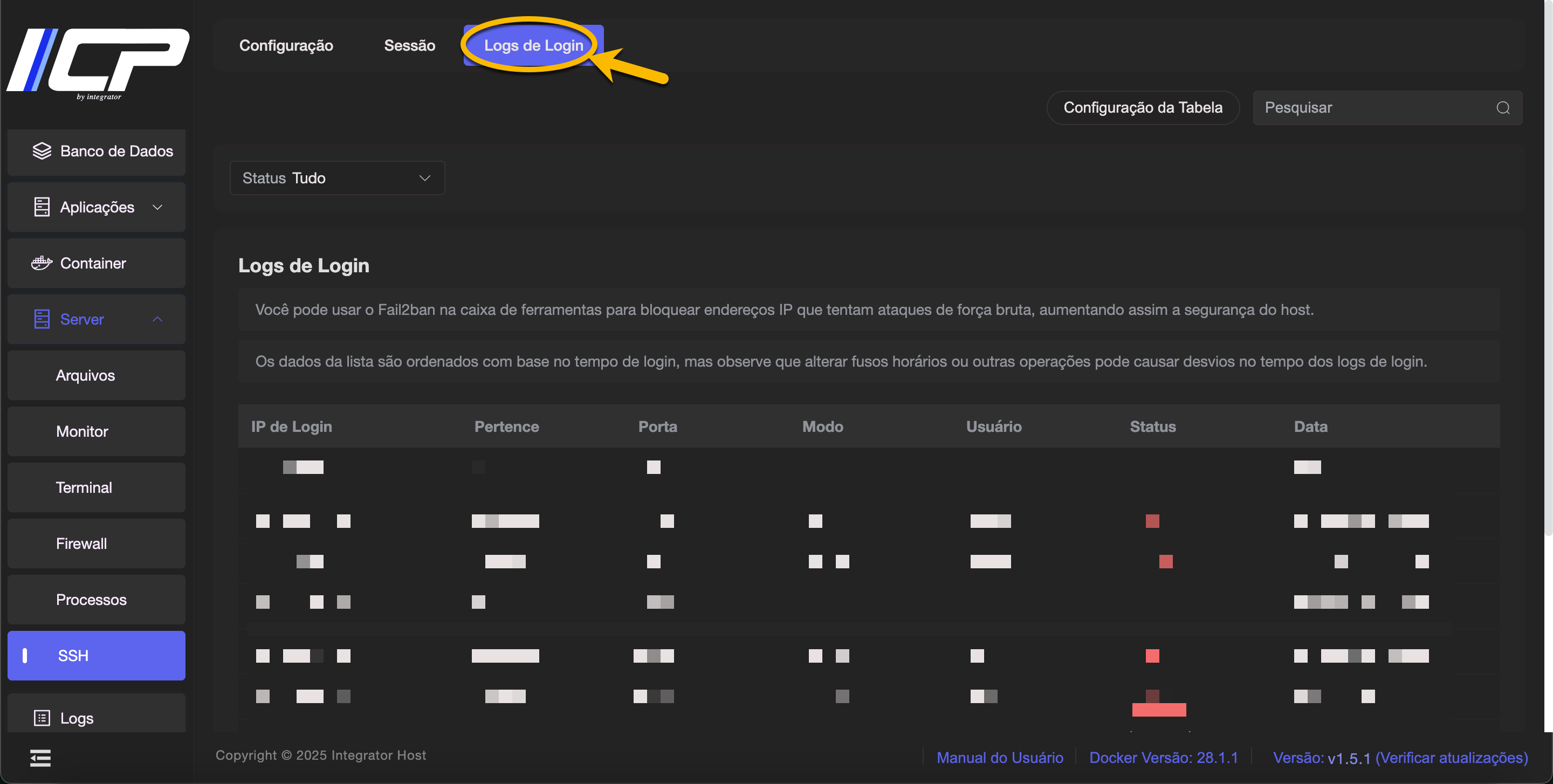 Aqui encontrará o registro de logs de logins realizados e também de acessos inválidos