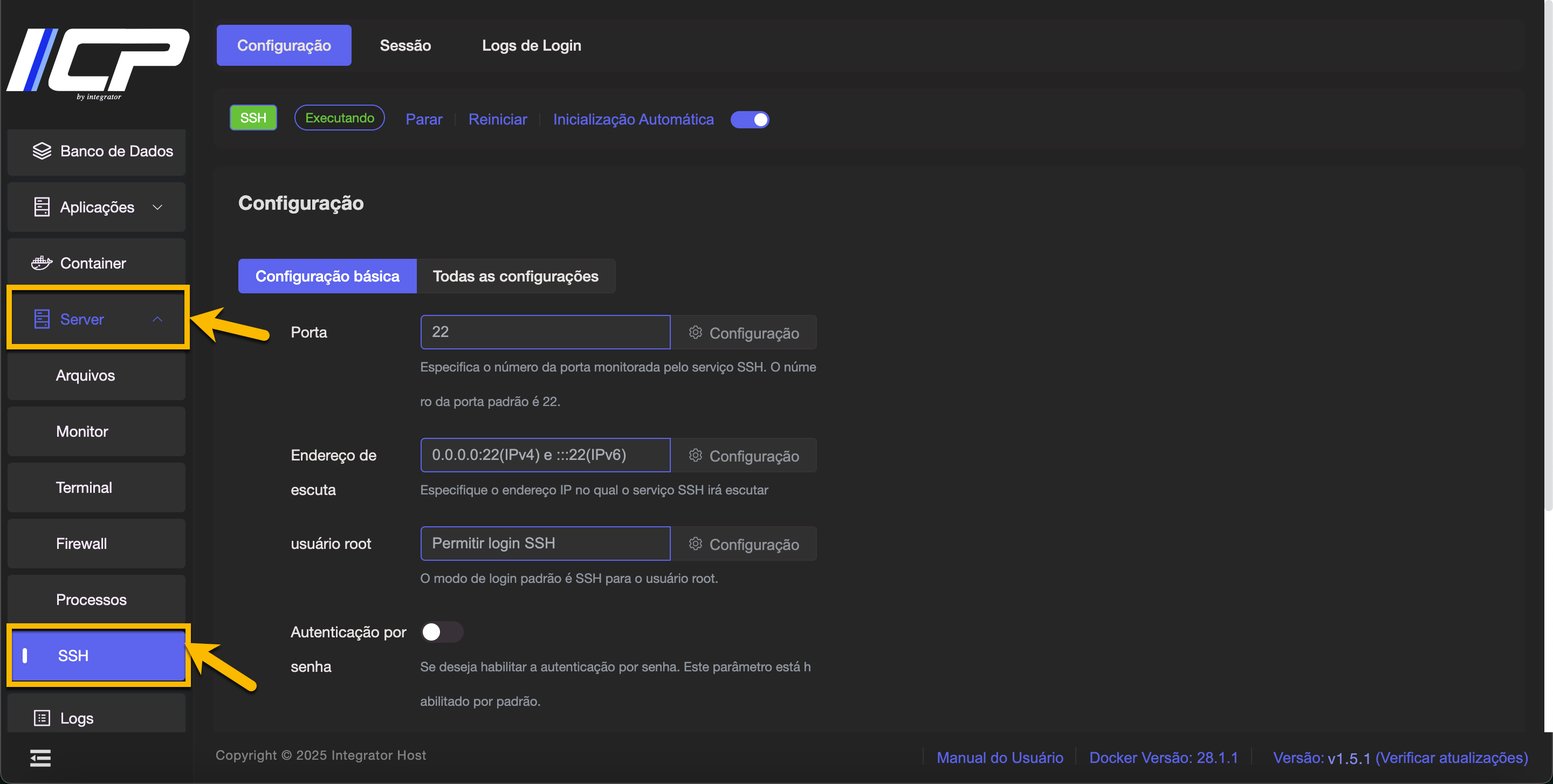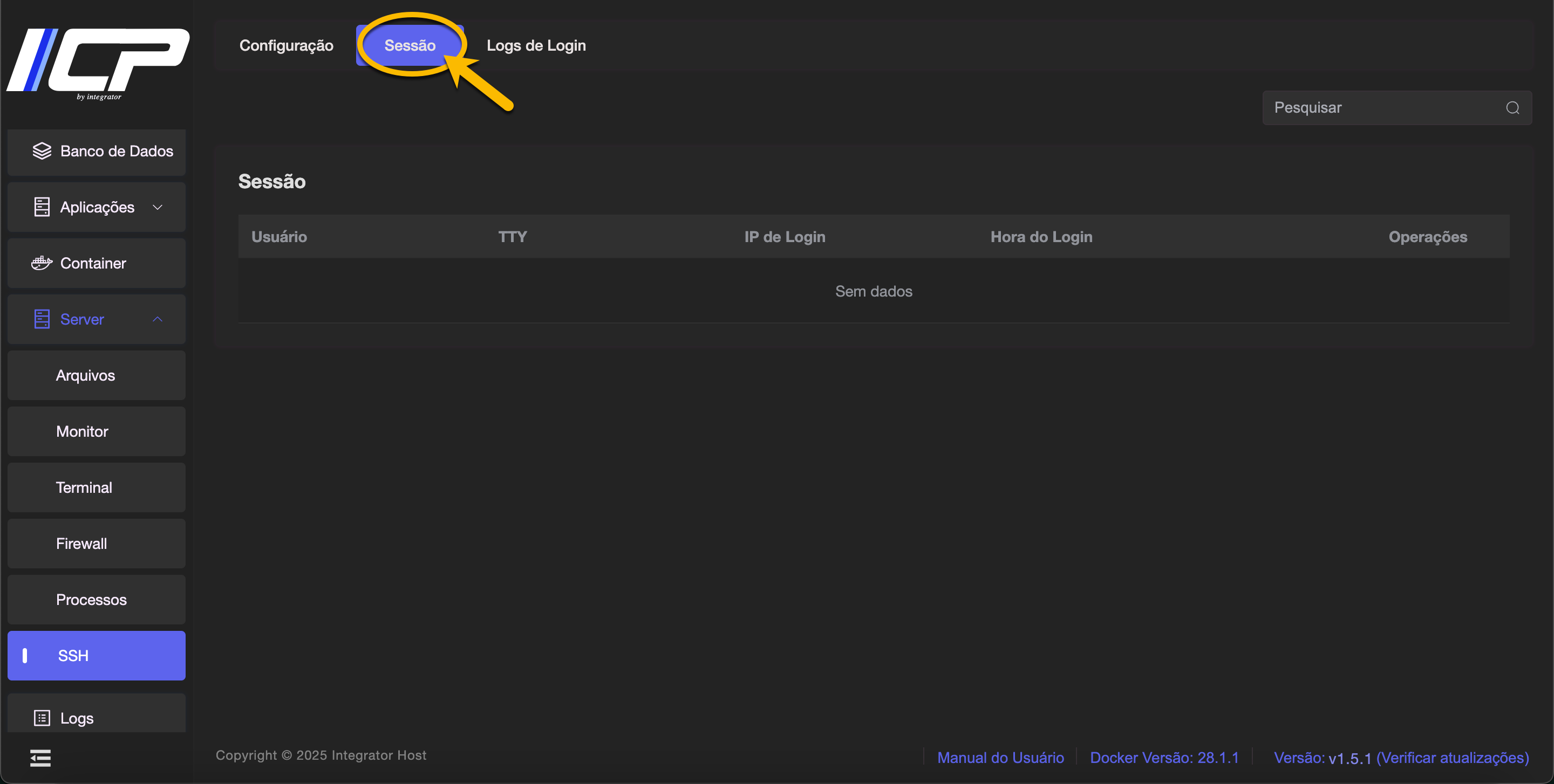 Aqui poderá visualizar as informações das sessões ativas conectadas via SSH, incluindo o nome do usuário, o endereço IP de login e o horário de acesso