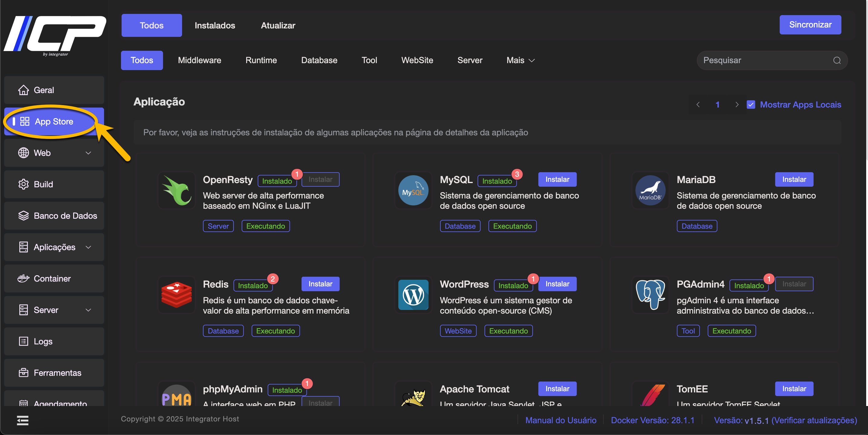 Acesse o Painel ICP digitando o endereço de acesso fornecido em seu e-mail de Configurações e Instruções de Uso (por exemplo, https://vpsXXXX.panel.icontainer.run:2090/admin).
