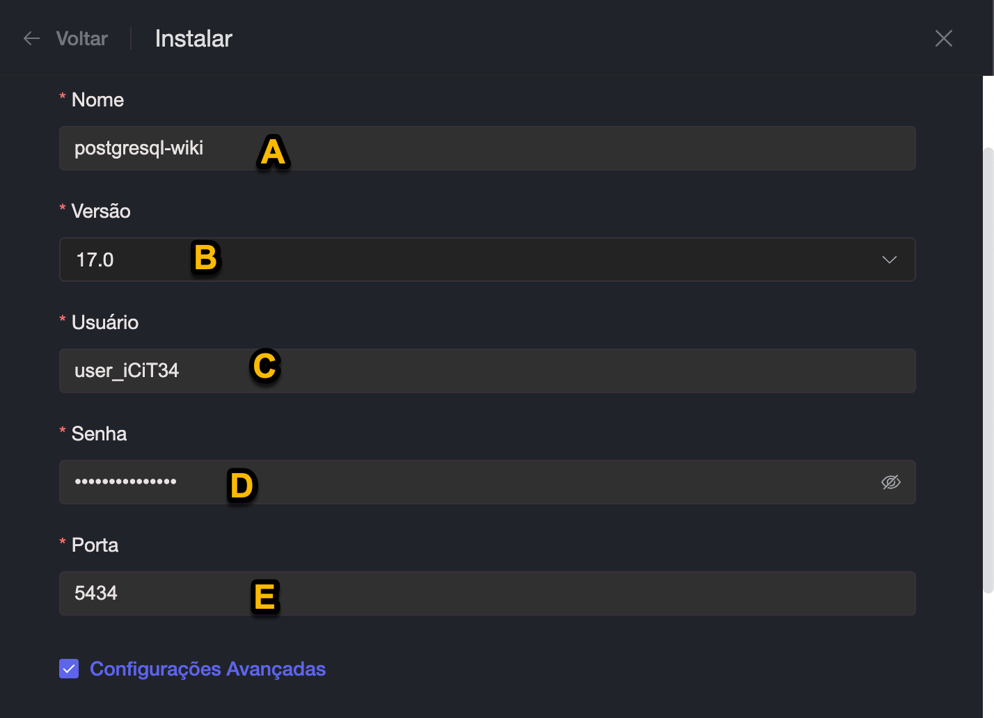 E. Informe a Porta que irá operar o PostgreSQL