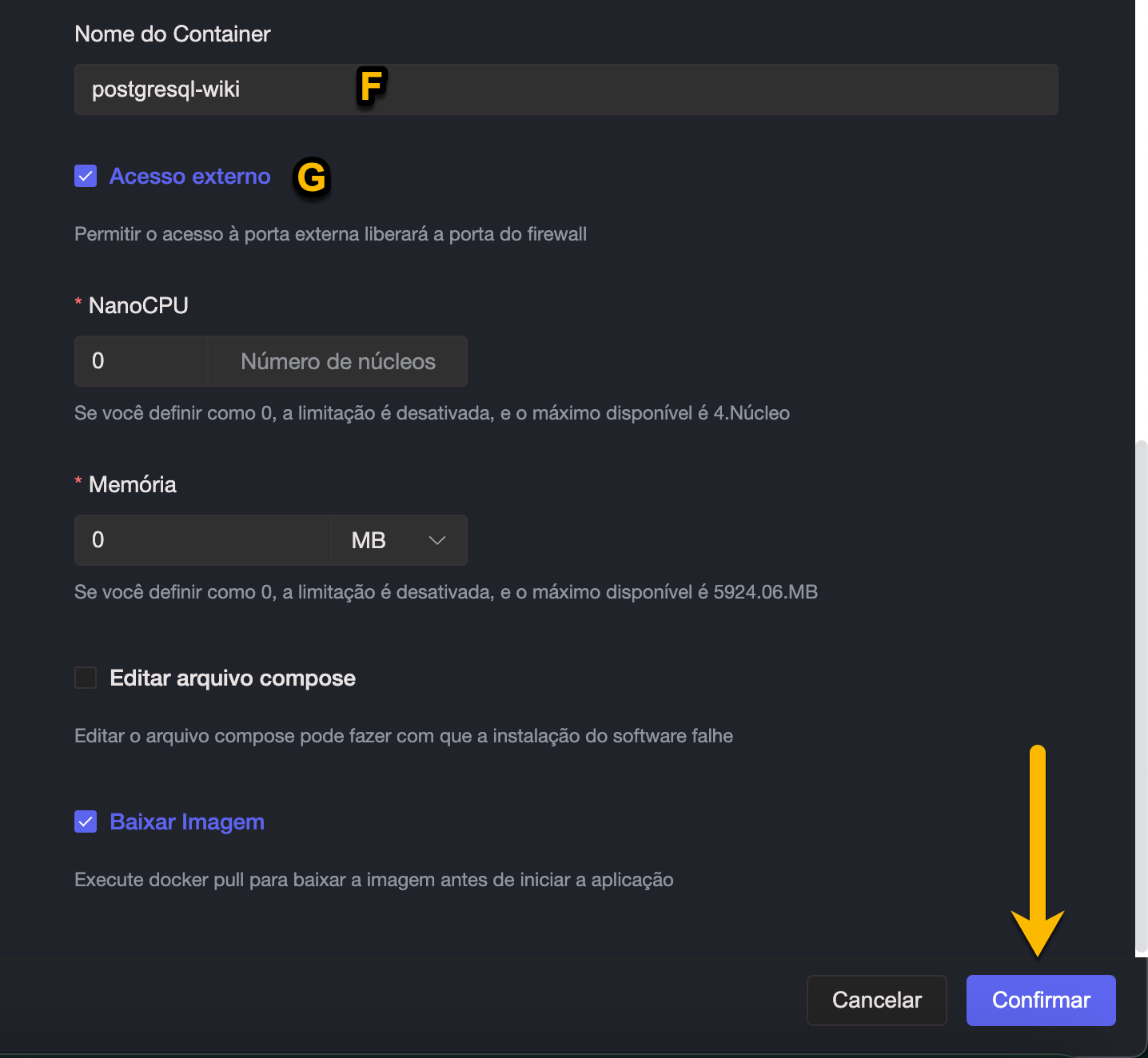 F. Digite o Nome do Container