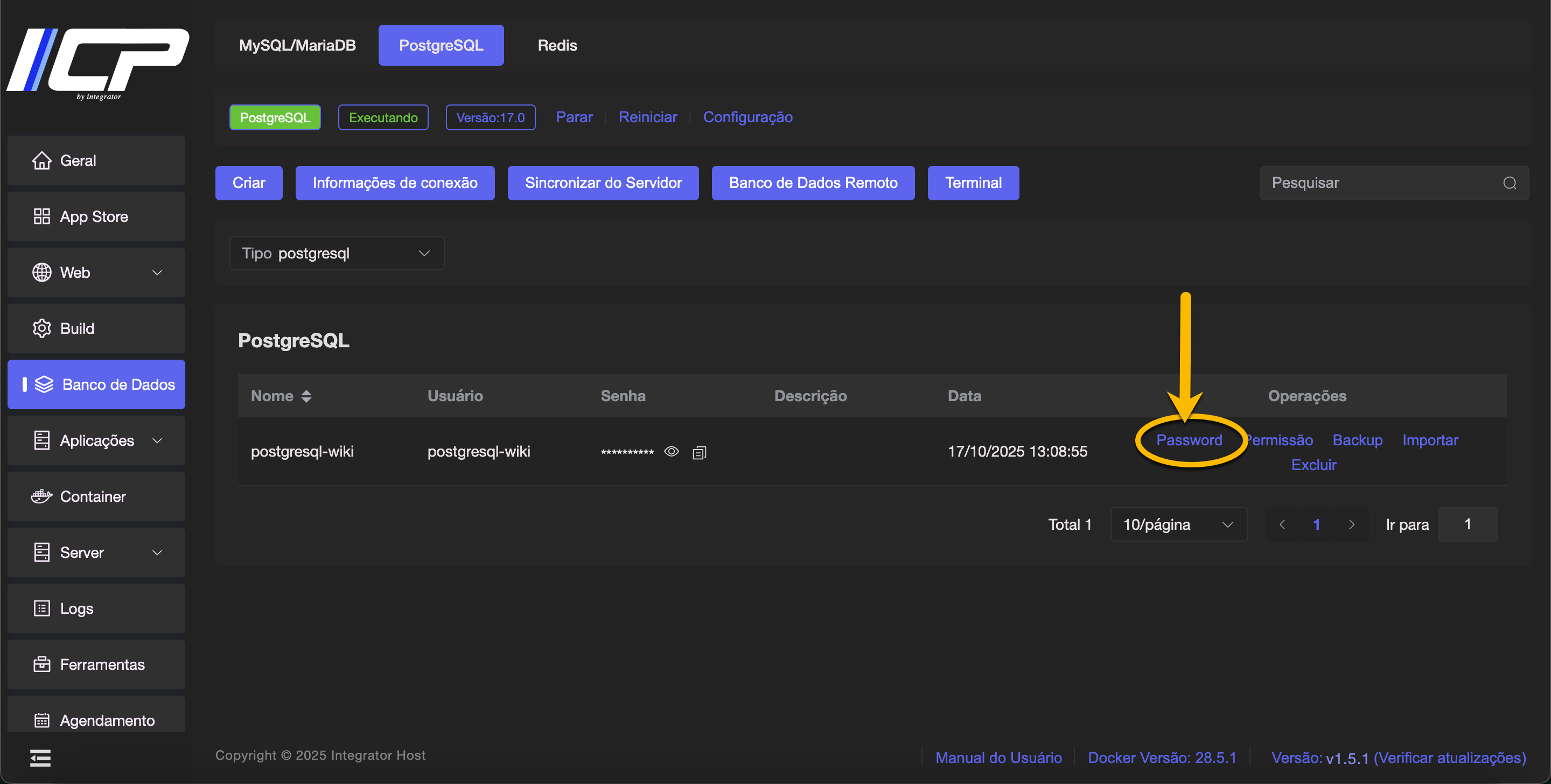 4. Encontre o banco de dados cuja senha deseja alterar