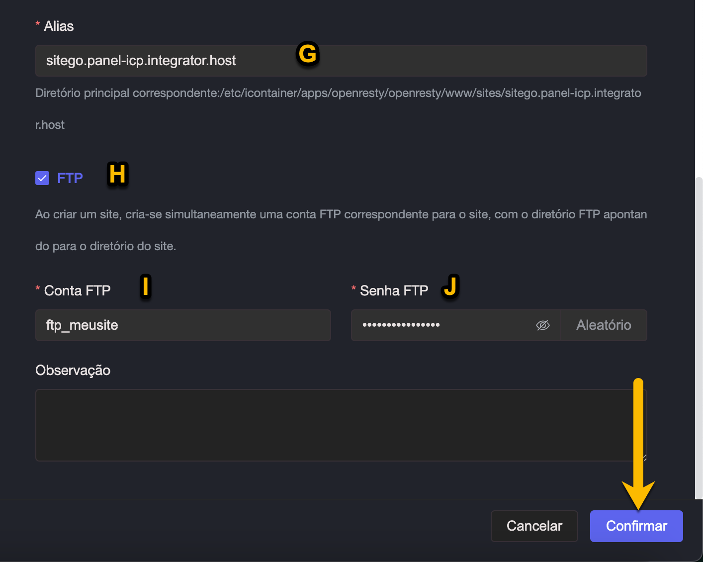 H. Marque a opção caso deseje criar uma conta FTP automaticamente vinculada a este site