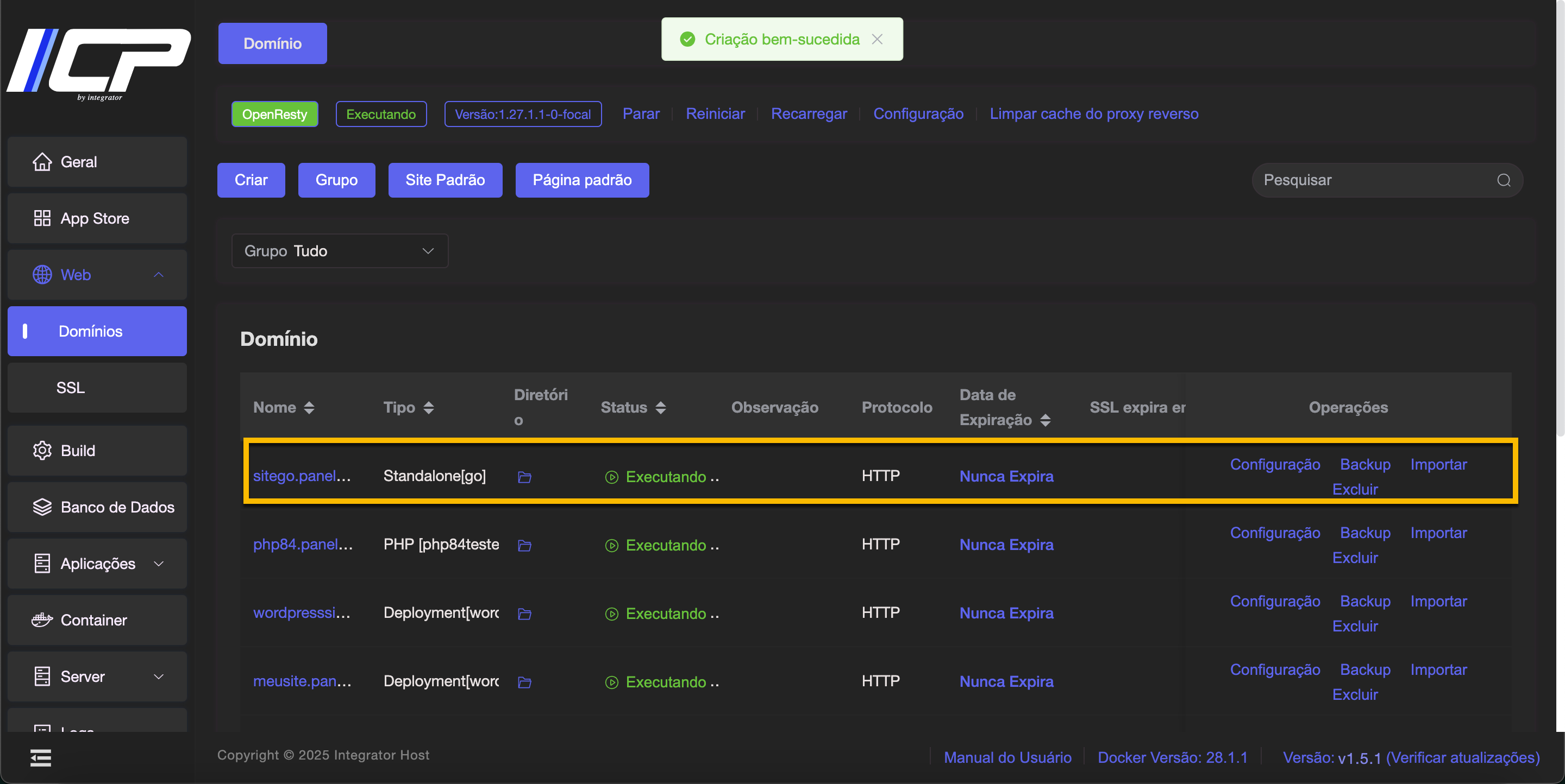 6. O Domínio recém-criado irá aparecer no topo da tabela