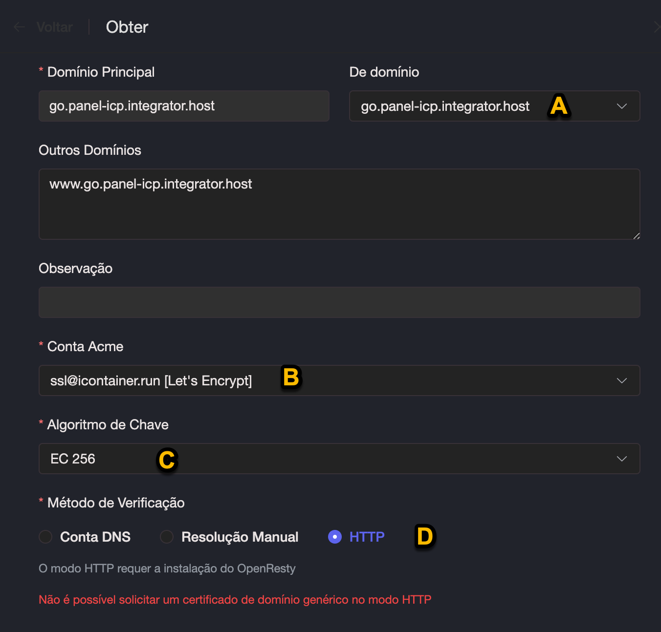 B. Escolha o certificado Let`s Encrypt