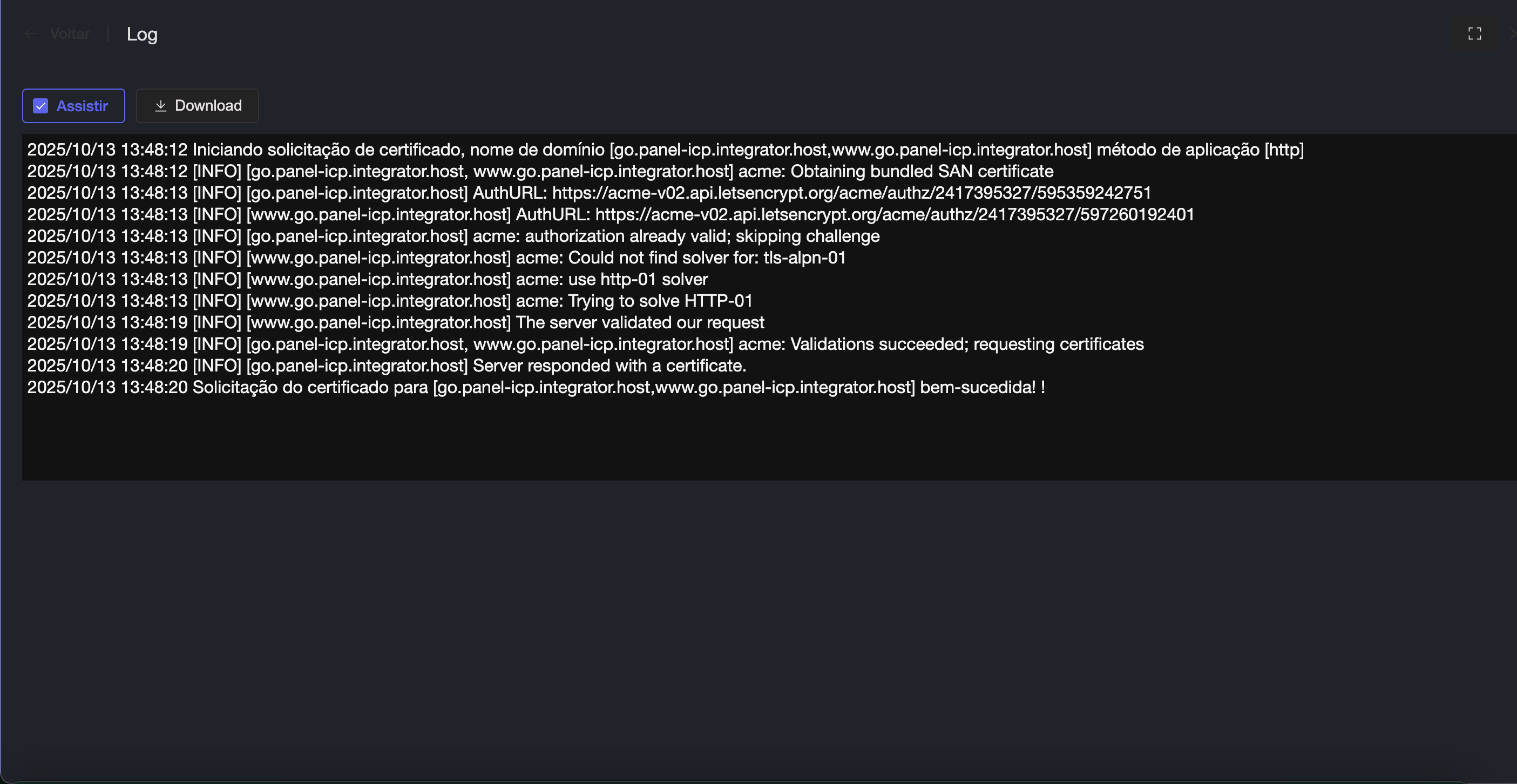 5. O processo será iniciado e você poderá acompanhar o progresso nos logs