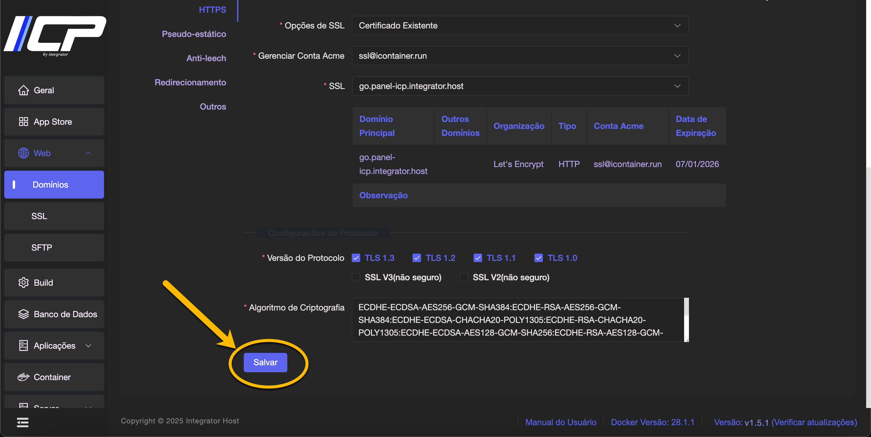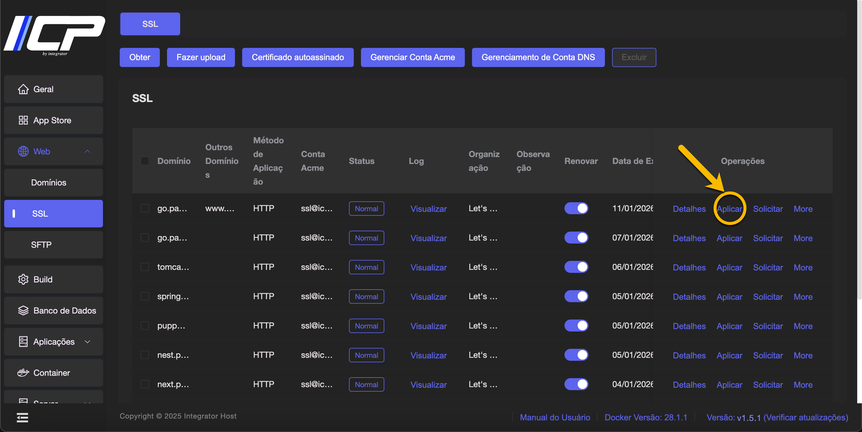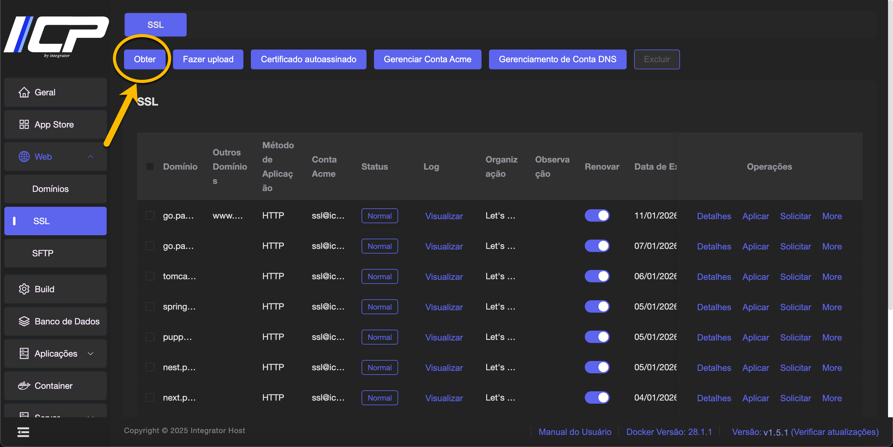 6. O SSL gerado aparecerá no topo da tabela