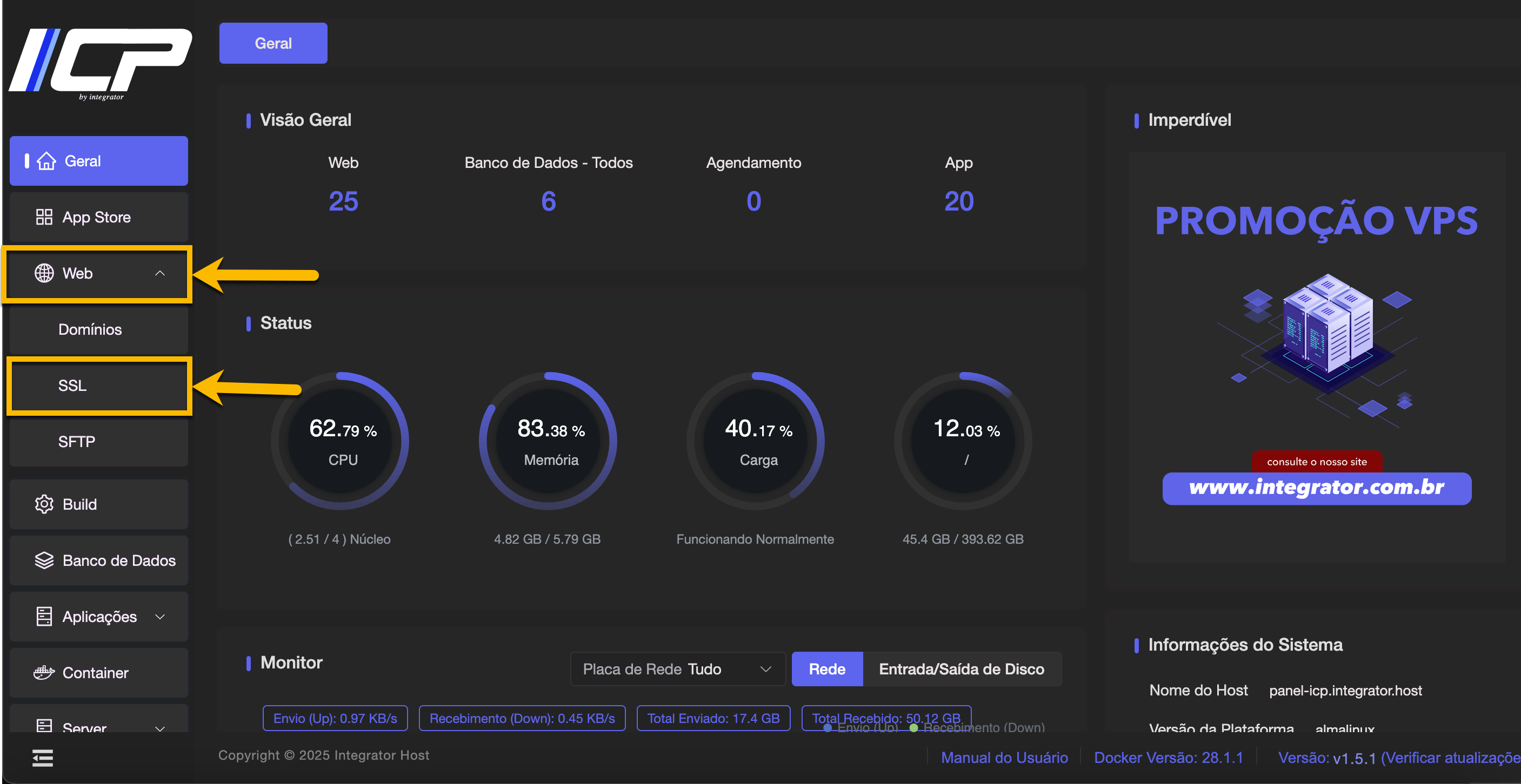 Acesse o Painel ICP digitando o endereço de acesso fornecido em seu e-mail de Configurações e Instruções de Uso (por exemplo, https://vpsXXXX.panel.icontainer.run:2090/admin).