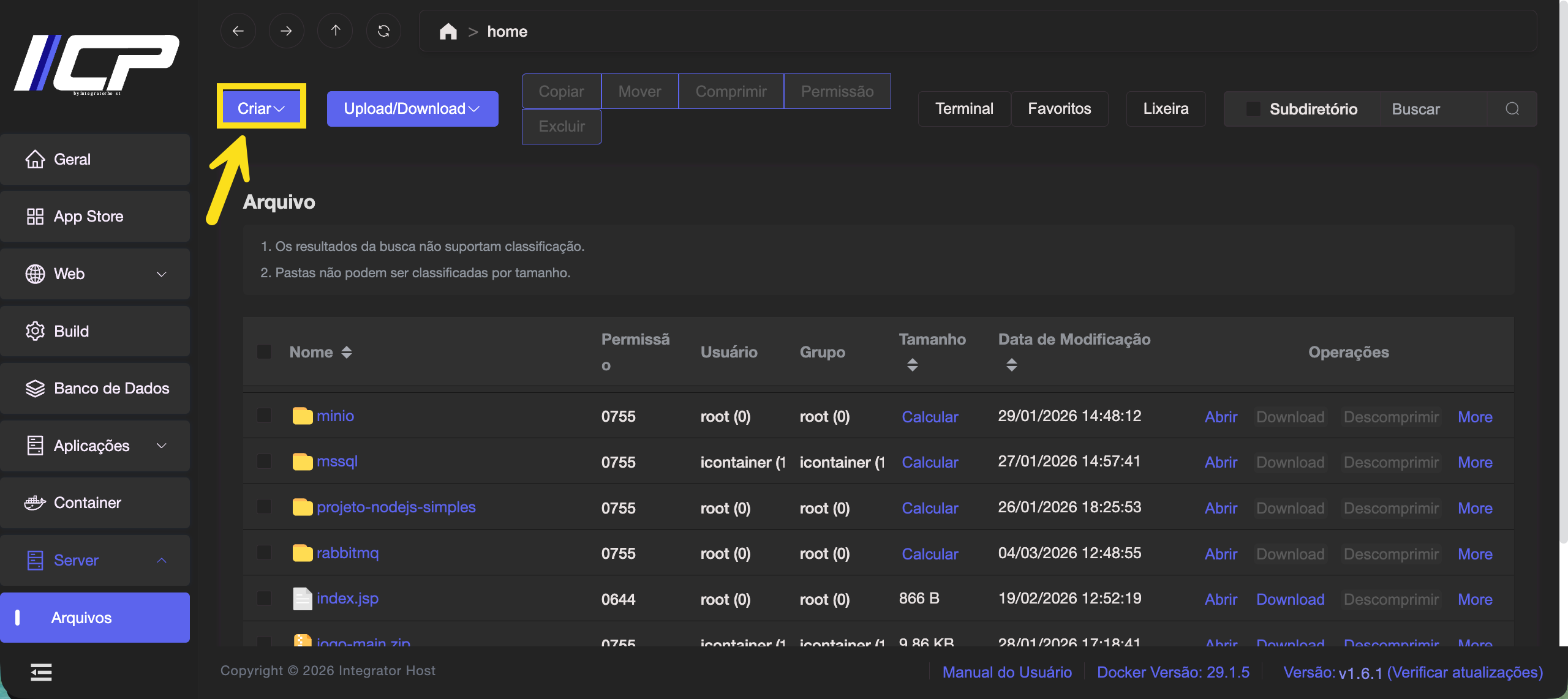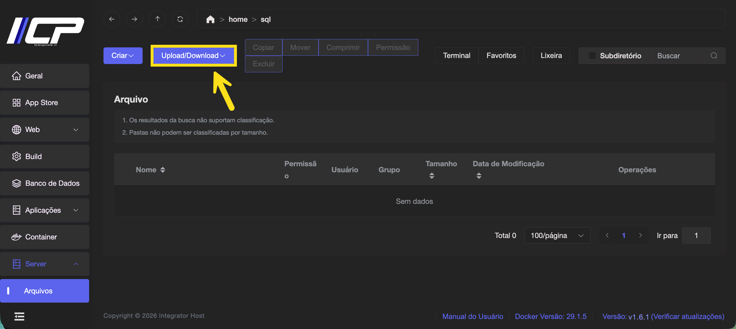 1.1. No menu lateral, acesse Server → Arquivos