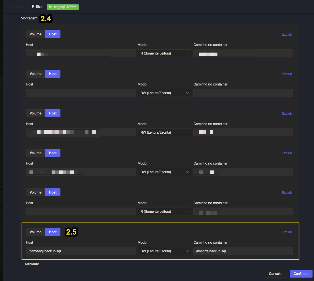 Após preencher, em Confirmar para o container ser reiniciado já com o volume montado